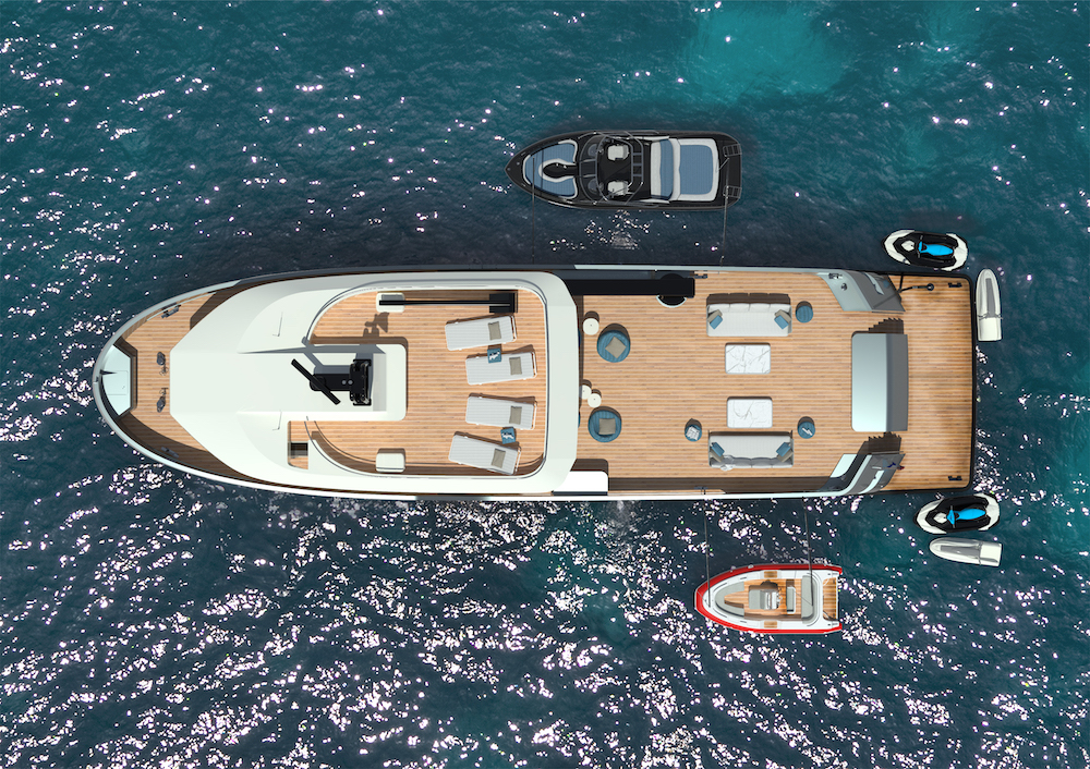The main interior feature is a big saloon with large windows and direct access to the main deck, which with its 70-square-metres once the toys have been launched, becomes the ideal place to enjoy the sun or a barbeque party or to unwind after a day of exploration. The sundeck on this first yacht will be equipped with a crane, and will house two Yamaha Wave runners and two Jetskis stand up. While the main deck will house an Air Nautique 21 and a five- metre RIB.