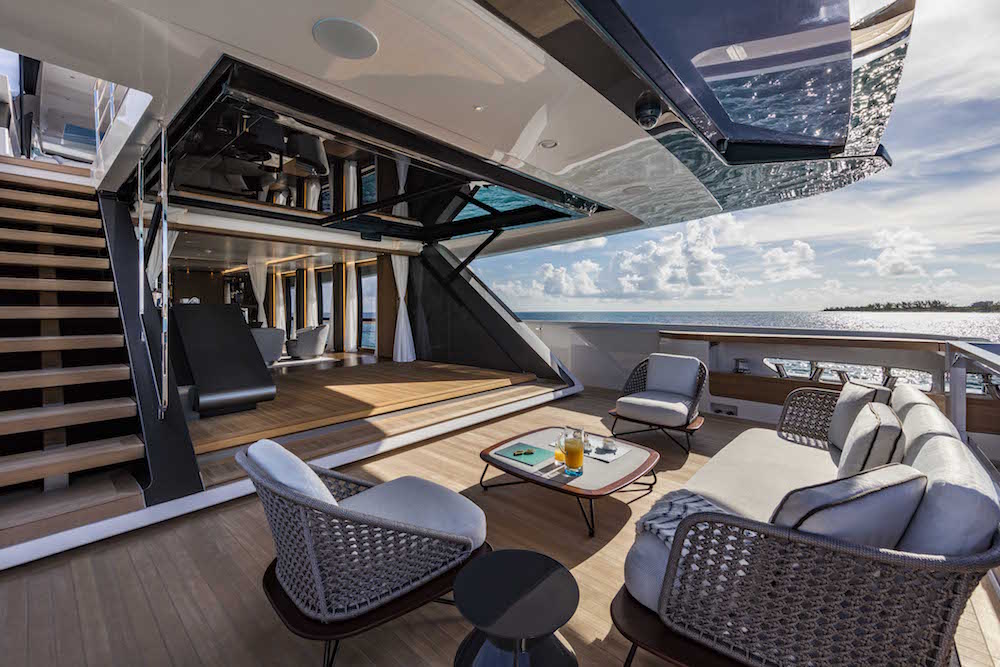The system also includes a non-reversible gear motor that ensures safe operation in the event of electrical failures. Through this high-tech mechanism, the tilting door creates a continuity between the cockpit and lounge areas, forming a single environment of over 80 square meters.
