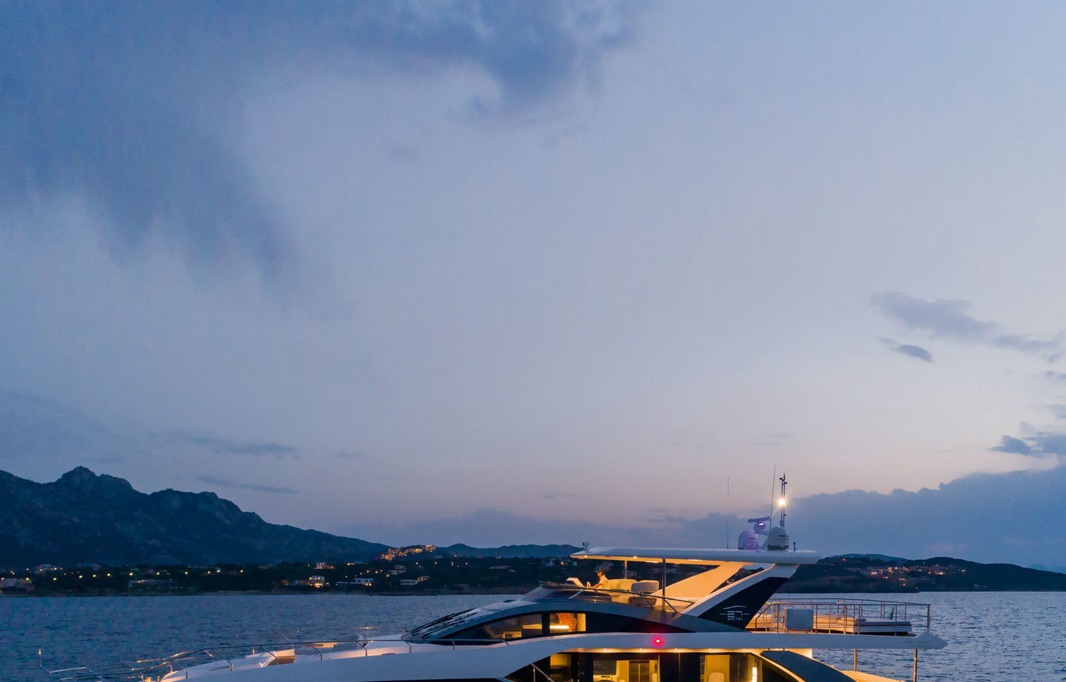 The extensive use of carbon fiber, for the hardtop, roll-bar, Flydeck, superstructure and transom, has made it possible to extend the space available without increasing the yacht’s weight, resulting in better performance in the water, unprecedented comfort on board and very generously sized convivial and private spaces.
