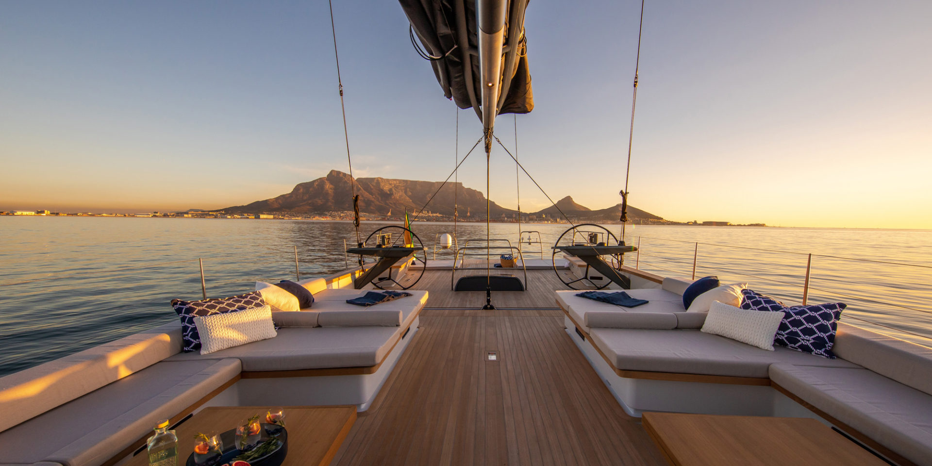 It has also created some intriguing opportunities, which Nauta has fully exploited. Along the coaming of the stepless cockpit, Gino has envisioned a solid-looking teak cap to provide an aesthetic highlight and a comfortable spot for the helmsperson and trimmers to perch under way. You would never realise that it is a nomex cored composite structure with rich teak veneer. It joins seamlessly to the hull side then bends to run parallel to the deck and looks as though it is floating over the cockpit, and is visually stunning by day, and even more special in the evening, when a hidden string of LED lights brings it to life.