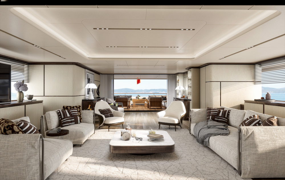Spaces are all well-arranged and optimized to guarantee exceptional quality and comfort on board. Giorgio M. Cassetta’s style enhances the horizontal development and, therefore, the length of the boat while the harmonious lateral lines streamline the overall mass of the superstructures. The only element that deliberately breaks the continuity of the boat’s line is represented by the bridge wings which, enhanced in their discontinuity by the surrounding surfaces, load the design with personality and exhibit an exquisite combination of form and function. The tails of the decks have been interpreted with an upward momentum and create a feeling of lightening of the superstructure and greater height of the external areas. The result is a hull with an imposing bow and clean and elegant streamlined lines.