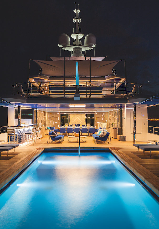 The most striking feature aboard is the giant 10-metre x 4-metre swimming pool that takes up a quarter of her main deck. It is, in fact, a structural part of the hull itself and can also be used underway. The pool provided the fulcrum for the design, the layouts, and the life of both the main deck and the rest of the boat. “For a couple like the owner and his wife who spend all their working days in air conditioned skyscrapers, having a boat they can live al fresco was an absolute must, regardless of the dimensions,” says Rover. Hence the dining area on the main deck with its 12-seater table is actually indoor-outdoor space with a system of hideaway sliding glass doors which can either connect it to the indoor TV lounge or the beach pool outside. The latter can also be covered by 22 carbon-fibre panels to double as a basketball court.