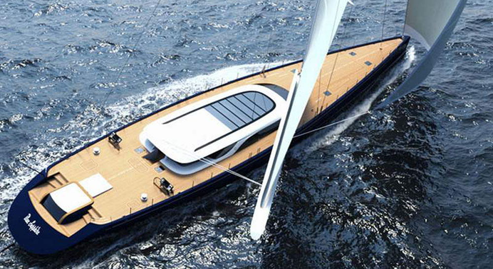 Blue Sapphire accommodates 10 guests, and 8 crew. The owner’s suite has a total dedicated space of 42.5 sq with an ample lounge area, studio and two bathrooms. Future owners are offered great design flexibility: one of four double guest cabins can be transformed into a gym. Blue Sapphire sloop presents a carbon fibre rig with a mast of 64.5 metres and EC6 rigging.