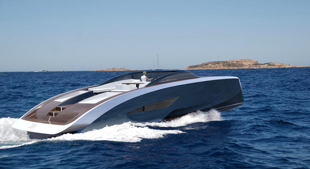 Under licence granted by Bugatti, the world renowned yacht brand has designed a new series of stunning and elegant open carbon-fibre sport yachts, featuring distinctive Bugatti design elements and advanced materials.