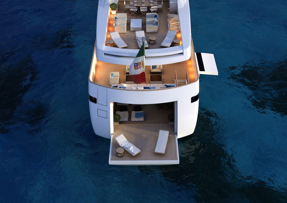 Per quanto riguarda l’organizzazione degli interni, la suite armatoriale è a prua del main deck mentre la sky lounge al ponte superiore ha un grande salone che amplia gli spazi di privacy dell’armatore.