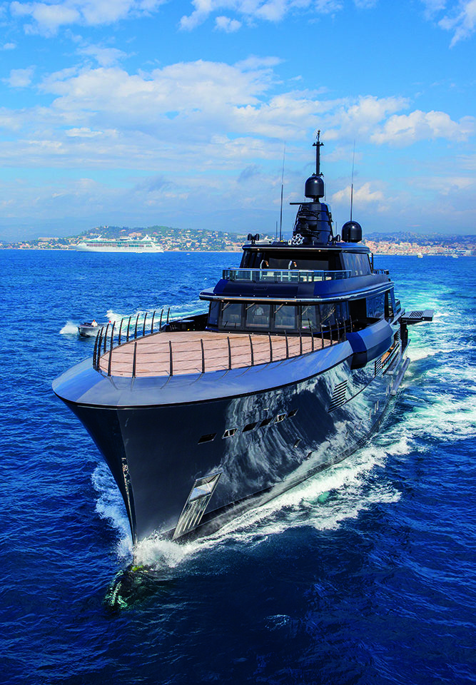 It leads out to the forward area too where there is an up-anddown hideaway table, free-standing seating and a large open space that doubles as a touch-and-go helipad. Last but very far from least, the sundeck is devoted entirely to the art of relaxation and also features another of the strongest signatures of Atlante’s exterior design: polished stainless steel handrails that have an unusual trapezoid shape. The gleaming reflections and glints from their multifaceted surfaces add an extra allure to the already-fascinating Atlante, a yacht with a uniquely powerful personal style.