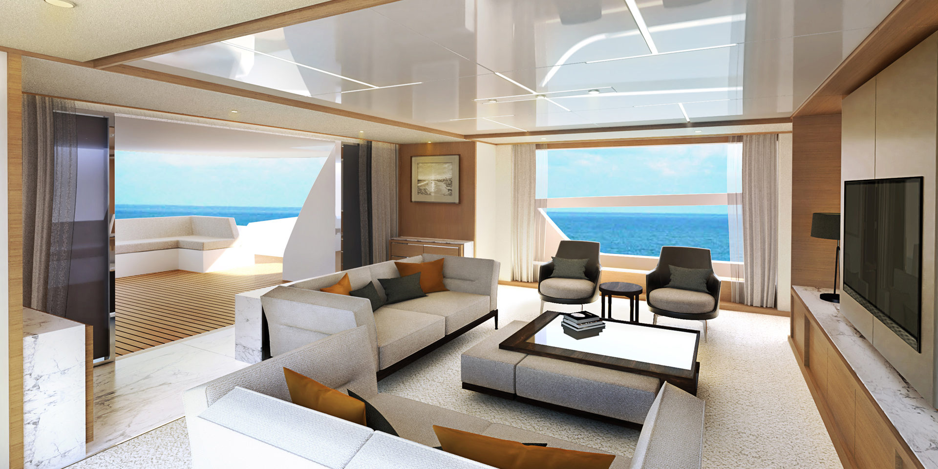 The interior living space is designed to be sociable, with a focus on comfort and easy access to and from the external deck areas, and the main saloon provides both a relaxed lounge area as well as a more formal dining setup.