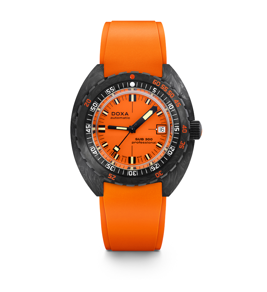 The use of carbon for the new Doxa SUB 300 carbon COSC collection. This family of watches builds on the success of the Sub 300 Aqua Lung US Divers in 2020, a limited edition of just 300 units. The SUB 300 carbon COSC comes in six colours – Orange Professional, Silver Searambler, Black Sharkhunter, Navy Caribbean, Yellow Divingstar and Turquoise Aquamarine – and ten versions.