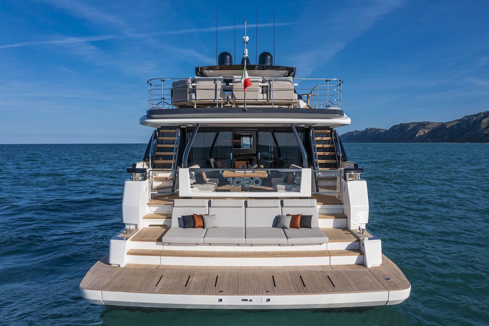 Sticking with a tried and tested layout, the latter is spread over two levels and is very versatile in terms of its uses, which include establishing physical contact with the sea. Which comes as no surprise as the Ferretti Yachts 1000 is a yacht that both promises and delivers a unique emotional experience.
