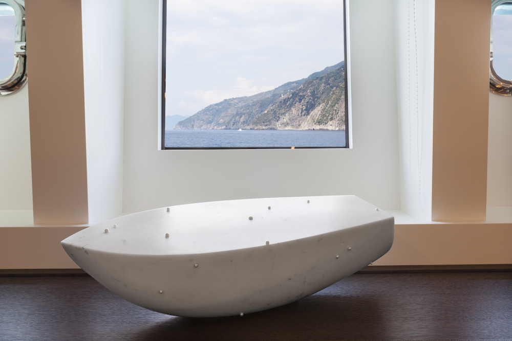 Carone’s work of art is a sculpture in absolute white Carrara marble that has the minimal, stylized shape of a hull. Carone then scattered on the surface of the marble block, in an apparently random way, some natural marine pearls having various sizes to reproduce a sort of constellation – the constant reference for sailors from time immemorial.