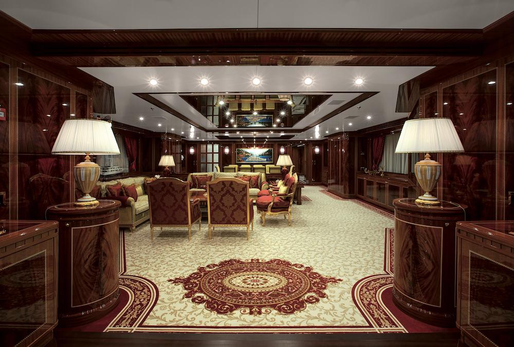 The flooring on the bridge deck, the hall and the main deck is a mix of gold Calcatta marble with yellow Siena inlay and black marquina. In the master and VIP bathrooms, honey onyx combines with masterful custom mosaic work by Sicis on the shower walls.