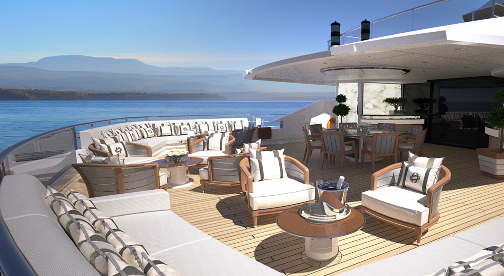 She will have an enormous amount of guest space – she has 357 square metres of deck space alone. Project Kometa offers guests no less than 12 leisure and chill-out amenities from a sun terrace to a beach club, a spa and hydromassage tub. Her technical spec includes a Fast Displacement Hull and fixed-pitch propellers combined with a Rolls Royce central booster jet. Project Kometa splashes in spring 2016.