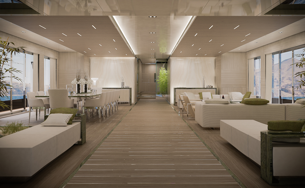 Two large tenders are present in the lower deck garage, while a helipad is located forward on the bridge deck. The beach club with shower and head is on the lower deck, a large pool welcomes you at the entrance of the main deck. The yard and yacht designer gave particular attention to the owner’s privacy developing a very private and direct access to the sky-lounge business meeting room from the exterior tender arrival position. The owner will use the yacht both for leisure and business and the layout has taking this into consideration.
