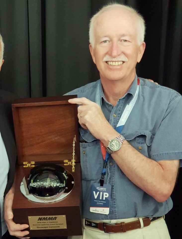 Giuseppe Carnevali, an Italian who describes himself as an inventor and a nomad citizen of the world because he lives in multiple countries, is a 70 years old naval architect and mechanical engineer who served in the Navy, won two National sailing championships, is an airplane and helicopter pilot, and a diver, with a knack for innovation. He proudly received an achievement award for innovation by the National Marine Manufacturers Association in Miami, Florida.