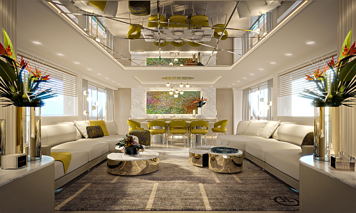 Il main saloon colpisce per la luminosità, accentuata dal gioco di rimando sullo specchio del soffitto: il bianco “nuvola” delle pareti, del divano e del grande tavolo da pranzo con top in marmo di Carrara, è riscaldato dalle finiture in metallo – leit motiv che ritroveremo in tutta la barca – dai coffee table in marmo o bronzo, dalle lampade e dalle deliziose sedie da pranzo, che, come i pouf, scelgono punte particolari di giallo acido per regalare movimento.