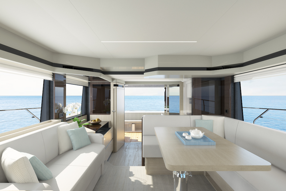 Relaxation outdoors is assured by a comfortable and versatile aft cockpit, which can be directly connected to the galley, where the sofa easily turns into a sun lounger. The Fly area, among the largest in the range, offers a table surrounded by a sofa, a full kitchen area, and a double steering position with another comfortable sun lounger. The third sunbathing area is located at the bow, easily accessible through a pleasant and well-protected walkway.