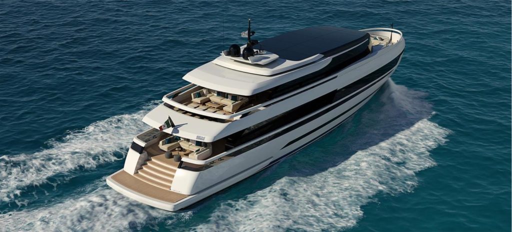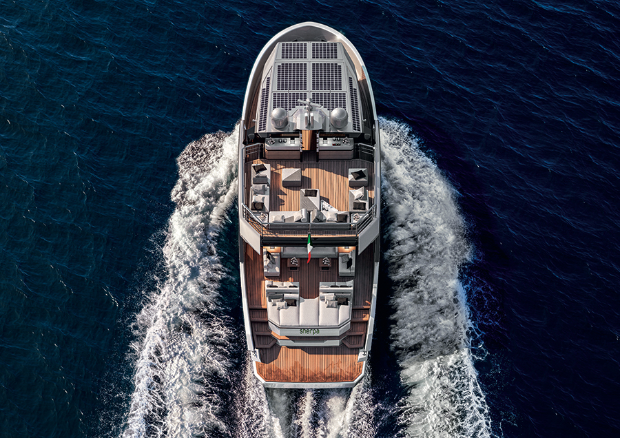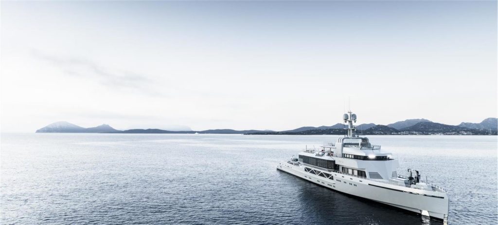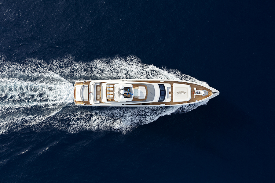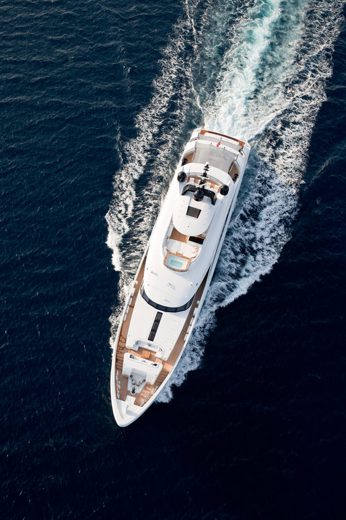 Design e Tecnologia, di cui l’infinity pool a prua, ideata con due zone distinte di prendisole che si immergono in una piscina con cascata, ed il beach club a poppa, con il portellone che si apre creando una piattaforma sul mare e lasciando intravedere una vera e propria zona multifunzionale, sono soltanto due esempi. Questa capacità di sorprendere si estende anche a livello tecnico: velocità di crociera di 11 nodi per un’autonomia di oltre 4500 mn; consumi molto ridotti grazie alla particolare configurazione della carena ottimizzata con CFD e testata in vasca; stabilità sia all’ancora sia in navigazione; impiego di tecnologie e materiali di ultima generazione per il contenimento di rumorosità e vibrazioni.