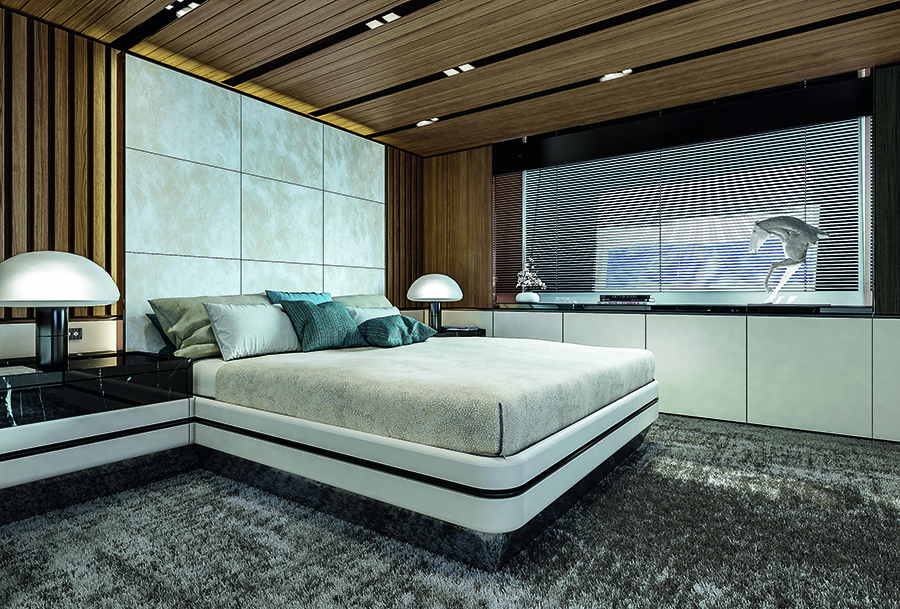 Sul lower deck si trova il beach club di 200 mq rivestito in teak, che include bar, sauna e bagno turco, diverse zone relax e chaise-lounge. Sul main deck ci sono quattro cabine ospiti e una cabina Vip panoramica. Il quarto ponte, ad uso esclusivo dell’Armatore, comprende una cabina di 110 mq con vista a 180 gradi sul ponte di prua ad uso privato, sala da bagno rivestita in travertino romano e sauna, guardaroba separato e vanity.