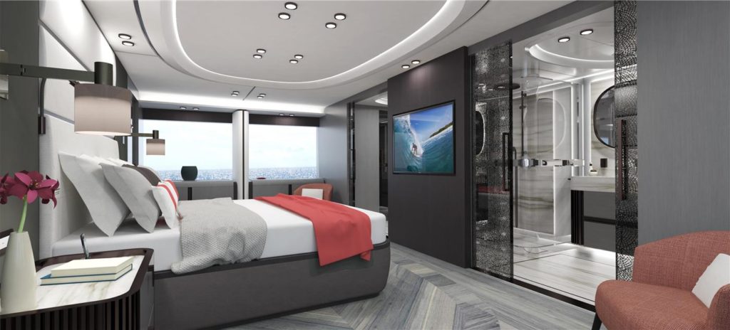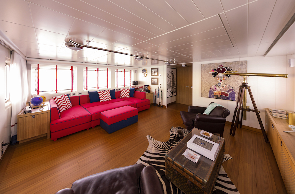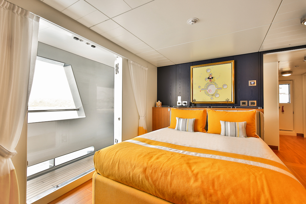 TGli spazi esterni, con zona pranzo e area relax, sono pensati per vivere all’aperto ogni momento della giornata. Estesa su una superficie di oltre 160 mq, la cabina armatoriale è quasi interamente circondata da finestrature a tutta altezza che offrono una vista panoramica ed un’intensa luminosità. L’appartamento si completa con unaterrazza esterna di 55 mq e un helipad touch and go. Il Main Deck propone un’inedita soluzione che accoglie un’area giochi dedicata ai bambini e la loro cabina doppia speculare a quella per la baby-sitter che dispone anche di un piccolo salottino con poltrone e un terrazzino privato che si affaccia sul mare.