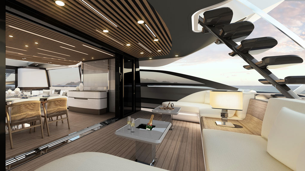 Sul ponte principale, il pozzetto accoglierà un sunbed sovradimensionato, un divano a U, coffee tables e una zona bar. Gli interni comprendono un grande salone, la sala da pranzo, la cucina e una superba suite armatoriale con ufficio e lounge dotata di terrazza apribile a dritta e una grande finestratura apribile a sinistra. L’upper deck è stato concepito con grandi aree esterne per il relax degli ospiti, con tavolo da pranzo e accesso a una confortevole skylounge. A prua ecco il solarium e una open-air lounge, entrambi concepiti per offrire la massima privacy. Spazio al comfort anche sul fly deck, con aree relax dotate di divani, sun beds, tavoli up&down, bar e grande jacuzzi.
