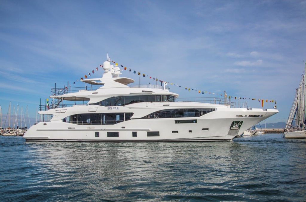 In banchina a Monaco ci sarà anche “Big Five”, laquinta unità di Mediterraneo 116. Gli esterni di questo yacht dislocante di 35,5 metri con scafo in vetroresina e sovrastruttura in fibra di carbonio sono disegnati da Giorgio M. Cassetta, mentre gli interni sono a cura dell’Interior Style Department di Benetti