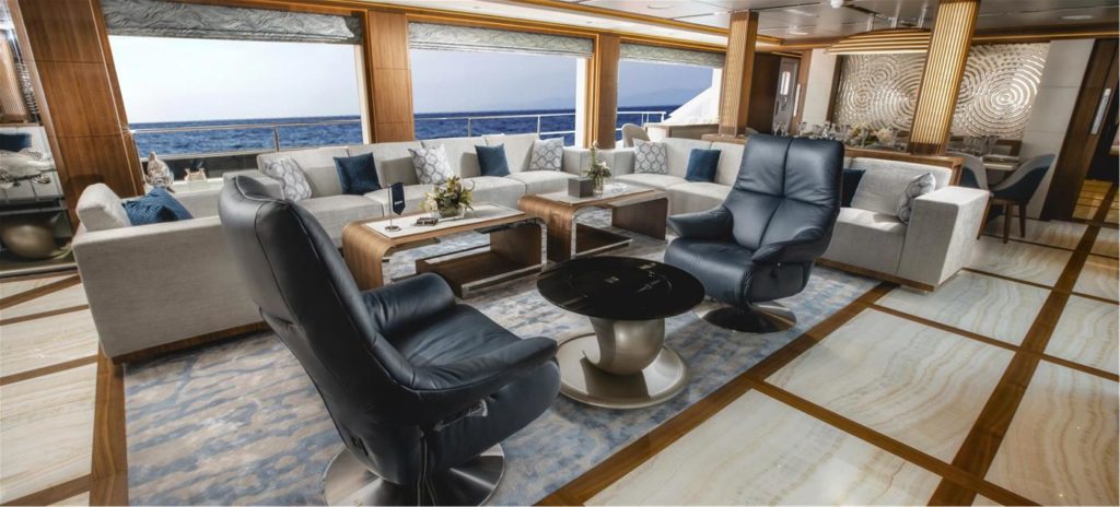 Accoglie fino a 12 ospiti in sei cabine, una delle quali è una suite armatoriale di 85 metri quadrati sul main deck che prevede palestra, bagno turco e ufficio dedicati. Reymond Langton Design ha disegnato per Galvas interni interamente basati su un brief perentorio dell’armatore: atmosfere ricche e raffinate, con dettagli importanti.