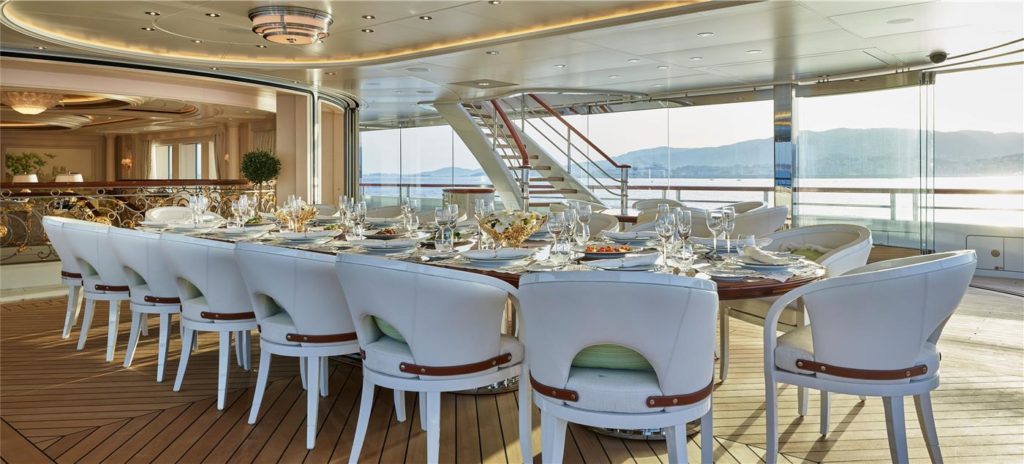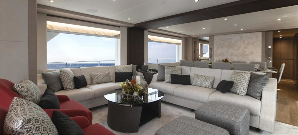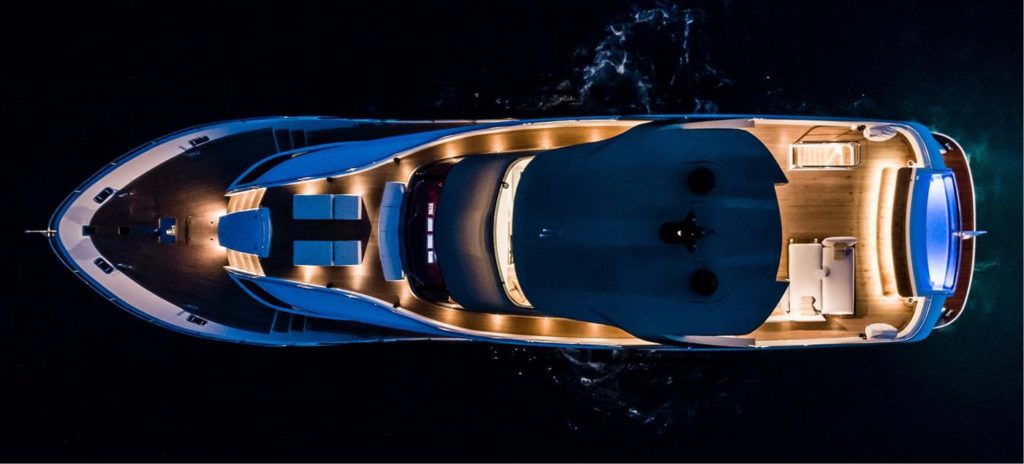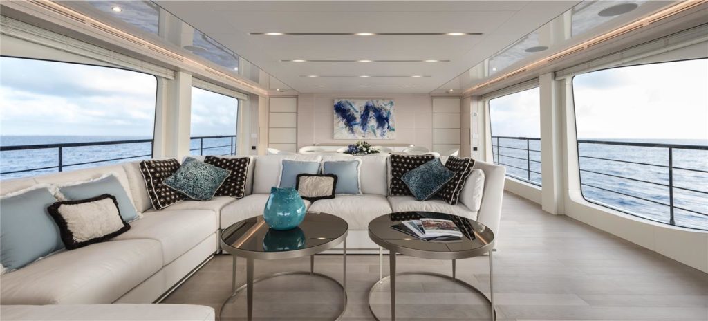 Volumi che lo rendono lo yacht ideale per la socializzazione e l’intrattenimento con la famiglia e gli amici. Ad esempio, l’upper deck vanta una dining area esterna con TV, bar, un grande sofa e chaise-lounge oltre a un’ampia area prendisole e diverse sedute.