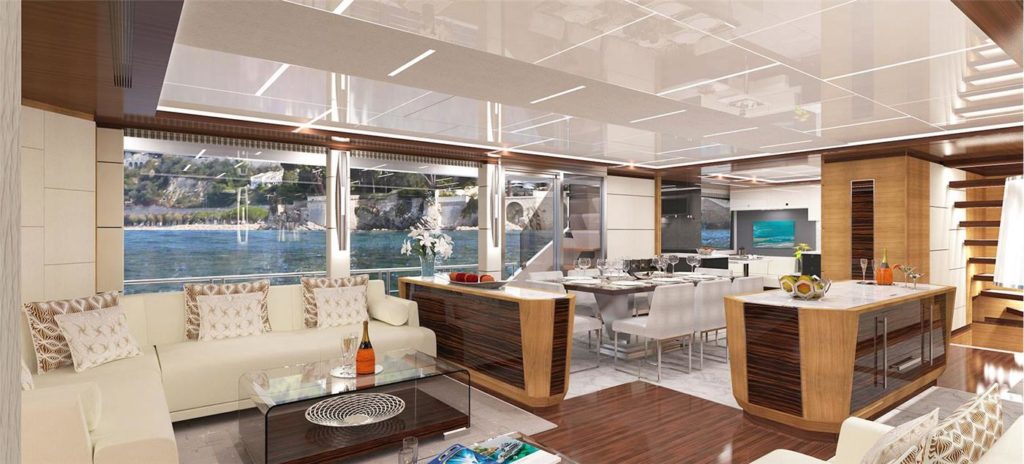 Oltre al grande salone open space completo di sala da pranzo, il ponte principale prevede quattro cabine ospiti doppie e una grande suite armatoriale full beam ed è interamente inondato di luce naturale grazie alle grandi finestrature a tutta altezza che regalano anche panorami mozzafiato. A poppa una scala consente l’accesso diretto al beach club che si trova sul ponte inferiore dove ci sono anche una palestra con vetrate a scomparsa, il ngarage per due tender custom da 7 metri e il quartiere equipaggio con dinette e sala controlli.