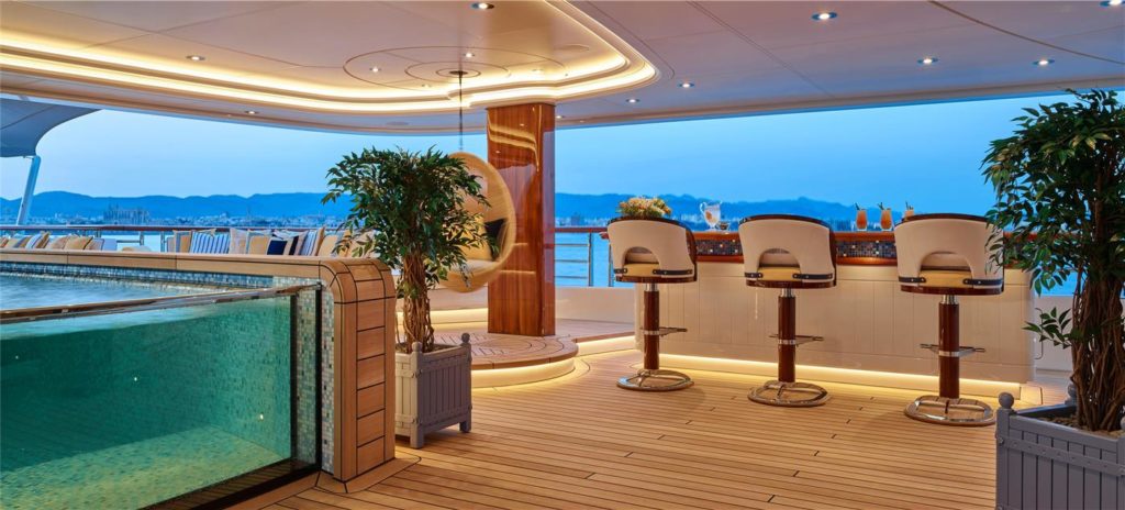 Un segno forte di design e di layout è la doppia scalinata che collega l’area piscina e pranzo al Beach Club completato da sauna, hammam, sala massaggi e palestra, au fil de l’eau. Con lo specchio di poppa e le piattaforme laterali aperte, il Beach Club copre un’area di ben 78 metri quadrati.