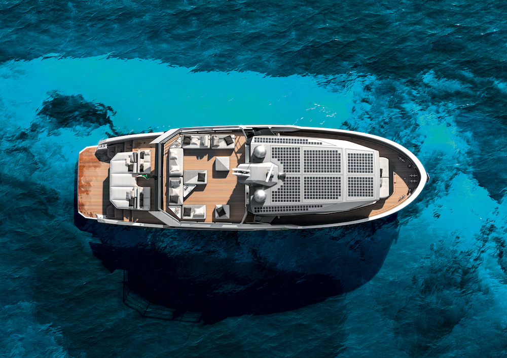 Sul ponte superiore si staglia la sun lounge con l’area bar, zona totalmente dedicata agli ospiti a differenza del tradizionali fly deck con timoneria esterna, mentre la skylounge è caratterizzata da ampie finestrature up&down. A poppa il pozzetto risulta connesso alla plancetta da una breve sequenza di scalini: si crea un gioco visivo e di incastri tra le murate e il basso volume che sorregge il prendisole e, grazie alle aperture sulle stesse murate, il mare è a vista.