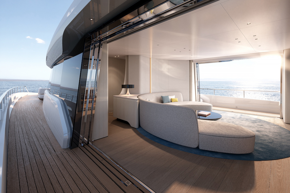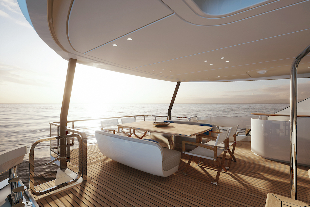 Lo spazio che si viene così a creare, pensato per essere versatile e incontrare tutte le esigenze dell’armatore, cambia grazie ad arredi trasformabili e diventa un salotto all’aperto in cui rilassarsi durante il giorno o una sala da pranzo con una vista sconfinata sul mare e un tavolo walkaround accessibile sui quattro lati.