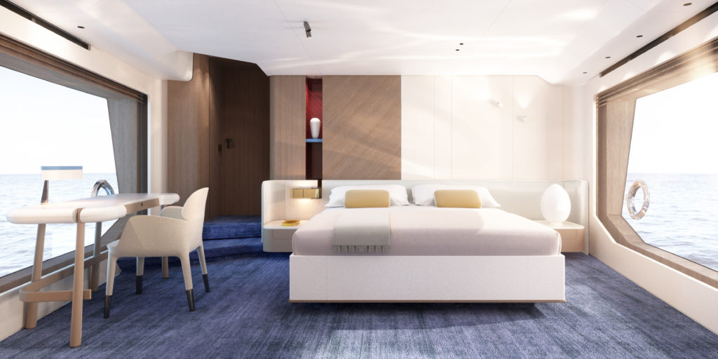 Gli interni sono infatti concepiti per offrire una suite armatoriale sul ponte principale con vetrate a tutta altezza, firma distintiva del designer Alberto Mancini, quattro cabine per gli ospiti sottocoperta e una zona crew posta a prua, accessibile direttamente dalla cucina e dal camminamento laterale: soluzione resa possibile dall’intuizione di progettare una timoneria parzialmente rialzata.