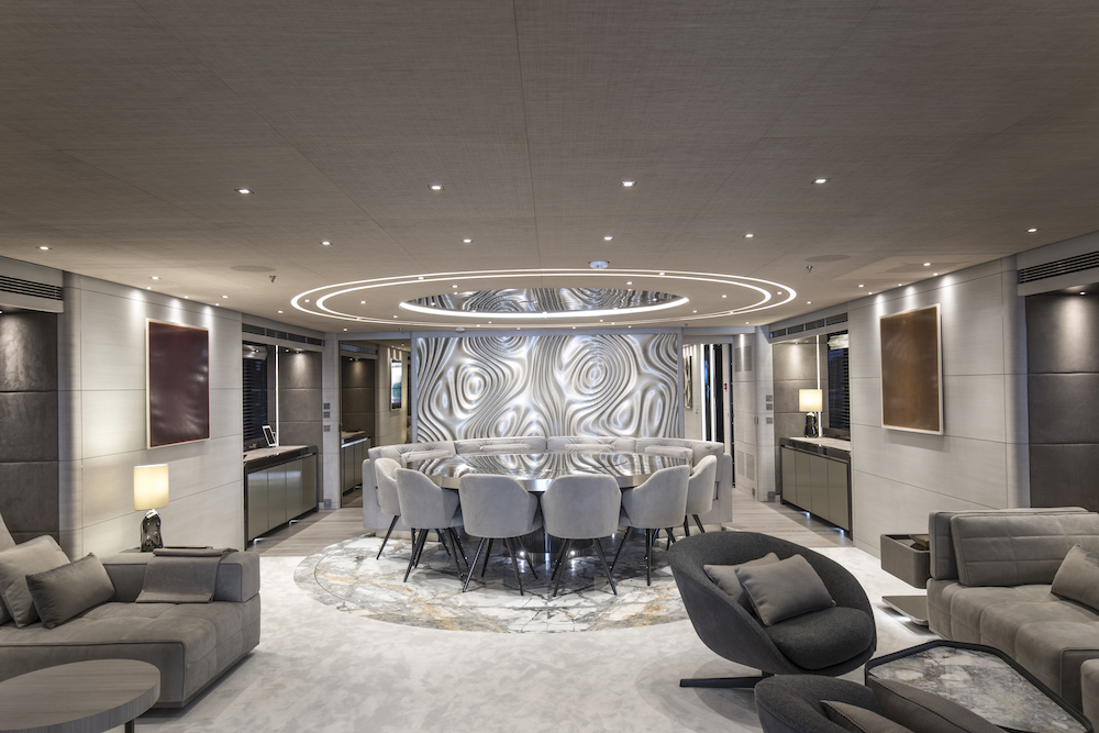 Un briefing impegnativo, ma che ha permesso di sviluppare elementi estremamente caratterizzanti non solo per l’arredo. Un esempio è il tavolo da pranzo del main deck con parte centrale girevole a filo in specchio bronzato e in metallo satinato, ma anche una ricchissima tavolozza di materiali, finiture e colori.