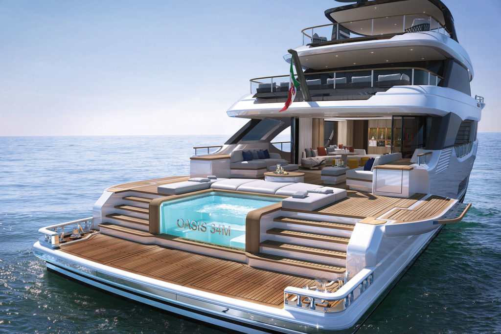 Sulla scia del successo di Oasis 40M, Benetti è ritornata prontamente a lavorare con RWD, per creare una “sorella minore” del primo esemplare e far così crescere la famiglia Oasis. OASIS 34M, più piccola e con un package ingegneristico differente, offre le stesse cinque caratteristiche dell’Oasis Deck™, conservando anche il garage per il tender sul fianco della barca. Lo studio newyorkese Bonetti/Kozerski, che ha creato gli interni del 40M, ha deciso di differenziare il design del 34M rispetto alla sorella maggiore donando agli ambienti un’atmosfera più sportiva e giovanile, e un look fresco con ampi open space. L’armatore può inoltre scegliere un layout meno tradizionale, con una zona pranzo più formale nella Skylounge dell’Upper Deck e un Main Deck meno impostato, arredato con divani, una zona tv e un bar a prua.