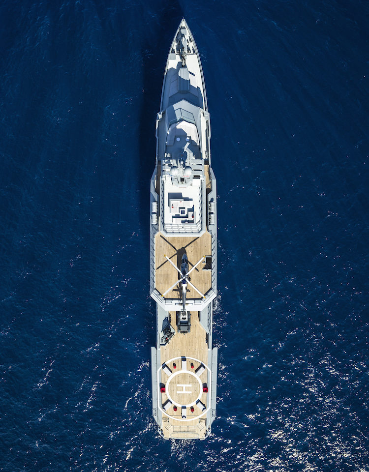 Sul main deck ci sono le cabine per gli ospiti, sette in tutto, mentre il lower deck è stato pensato per le sistemazioni dell’equipaggio: 24 persone in totale. Ancora una volta la modularità degli spazi scandisce il bridge deck dove è stata ricavata una seconda zona pranzo con bar annesso, più conviviale, che si affaccia su una superficie da utilizzare all’occorrenza per ospitare il secondo elicottero oppure per la vita all’aria aperta grazie anche alla presenza dei complementi di arredo firmati Paola Lenti.