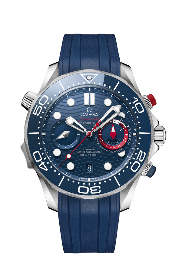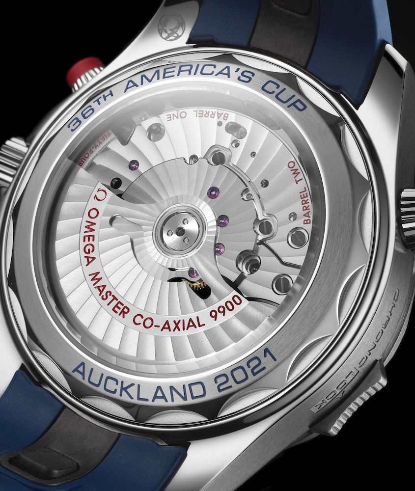 Per celebrare questo momento ha presentato il nuovo Seamaster Diver 300M America’s Cup che si distingue per il nuovo sistema di blocco del cronografo, il cinturino a cambio rapido e i pulsanti a prova di acqua. Realizzato in acciaio inossidabile, il cronografo da 44 mm ha un quadrante in ceramica blu e un anello della lunetta che presenta una scala di immersione in smalto bianco. Per un miglior utilizzo dell’orologio, in caso di onde elevate, OMEGA ha incluso dei pulsanti in gomma morbida progettati ergonomicamente per funzionare in modo efficiente col bagnato ed elegantemente evidenziati in rosso e blu.