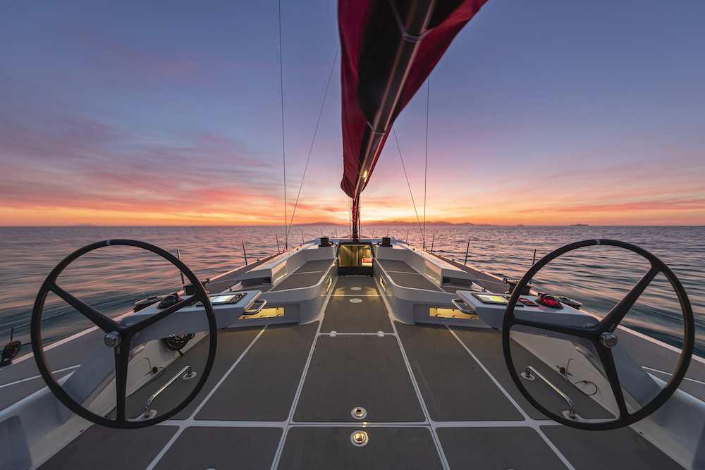 «Una grande ricerca a livello ergonomico, ma anche di progettazione. Siamo infatti riusciti a collocare il sistema della canting keel sotto il pagliolato, in una seduta del tavolo senza togliere spazio utile». Lo stesso per la cassa del canard, inserita nel bagno della cabina armatoriale che è collocata a prua in un layout degli interni classico: carteggio e cucina rispettivamente a dritta e a sinistra della discesa dal pozzetto, e grande living centrale con il leggero, non solo quanto a materiale, tavolo in carbonio della dinette fronteggiata da un divano.