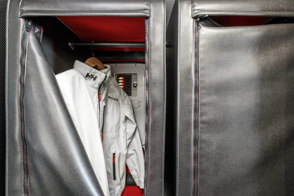«La fibra di carbonio ci ha aiutato molto a realizzare interni che riflettessero lo spirito della barca». Un interior design in qualche modo ‘aggressivo’, nel senso di deciso, evidente. D’altra parte l’armatore aveva anche chiesto interni al contempo comodi, leggeri quanto la barca e rapidamente adattabili alla regata. Così, per esempio, gli armadi sono vere e proprie valige di carbonio e pelle, facili da smontare e sbarcare e il design, così come gli ambienti, è all’insegna di linee asciutte, essenziali.