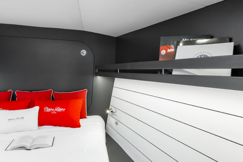A poppa, due cabine doppie con relativi bagni. In totale sei posti letto cui si aggiungono le due cuccette nella cabina marinaio di estrema prua. Ambienti nei quali viene esaltato il panel di materiali che distinguono i Mylius Yachts e che completano una barca leggera, sportiva e comoda. «Fosse un’auto, sarebbe una gran turismo» conclude Alberto Simeone. «Credo che abbiamo raggiunto gli obiettivi prefissati in maniera equilibrata, realizzando una barca che definirei pura. Una pura barca a vela. Ho sempre cercato di disegnare barche con meno compromessi possibili per arrivare ad avere una vera barca a vela. E questa lo è. Nella sua pura essenza».