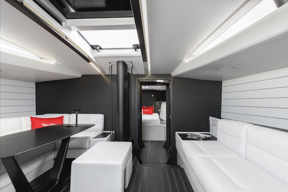 E quindi timonerie avanzate e, a prua del trasto della randa, un pozzetto di manovra separato da quello ospiti. Per il fiocco niente rotaie in coperta, ma un doppio barber hauler. Tutto all’insegna della facilità di manovra grazie ai winches idraulici. Il ponte è segnato da una serie di boccaporti, tambucci, portelli che, assieme alla sezione trasparente della tuga, danno luce e aria agli interni giocati sul nero hi-tech della fibra di carbonio di paratie, arredi e pagliolato e sul bianco di sedute, rivestimenti e cielini.