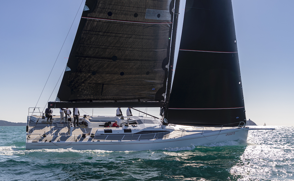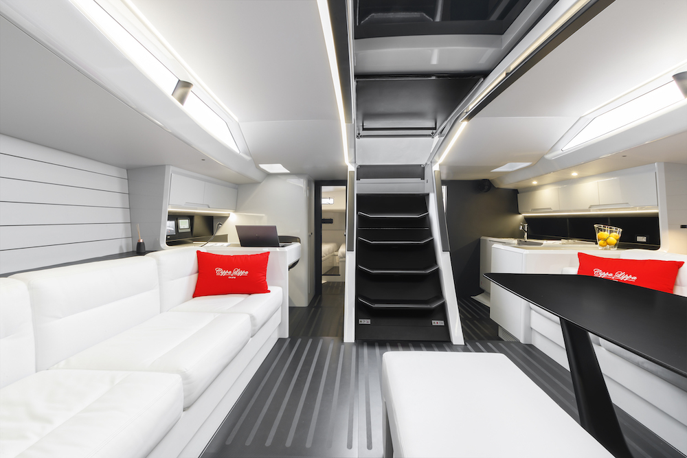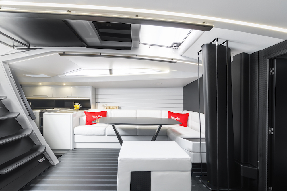 «Una grande ricerca a livello ergonomico, ma anche di progettazione. Siamo infatti riusciti a collocare il sistema della canting keel sotto il pagliolato, in una seduta del tavolo senza togliere spazio utile». Lo stesso per la cassa del canard, inserita nel bagno della cabina armatoriale che è collocata a prua in un layout degli interni classico: carteggio e cucina rispettivamente a dritta e a sinistra della discesa dal pozzetto, e grande living centrale con il leggero, non solo quanto a materiale, tavolo in carbonio della dinette fronteggiata da un divano.