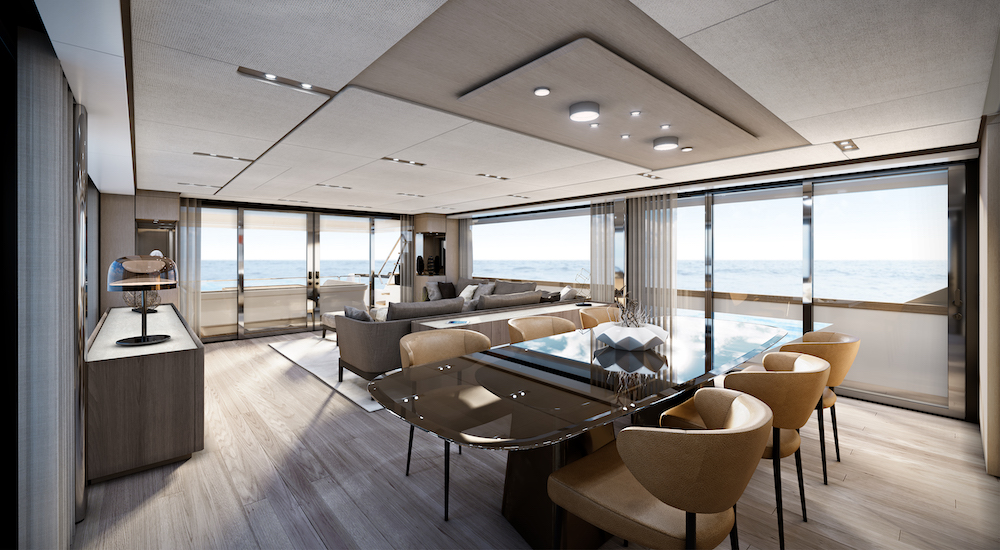 Linee che riprendono la filosofia progettuale inaugurata con gli ultimi modelli della gamma con però l’inserimento di nuove potenze laterali in cristallo sia a poppa sia a centro barca. Ma certo l’elemento più rilevante per la sua novità è la configurazione interamente wide body che significa grande disponibilità di spazi e la possibilità, come sottolinea l‘architetto Salvetti: «di introdurre un nuovo concetto di flusso a bordo volto a diventare un elemento iconico per le grandi di gamma».