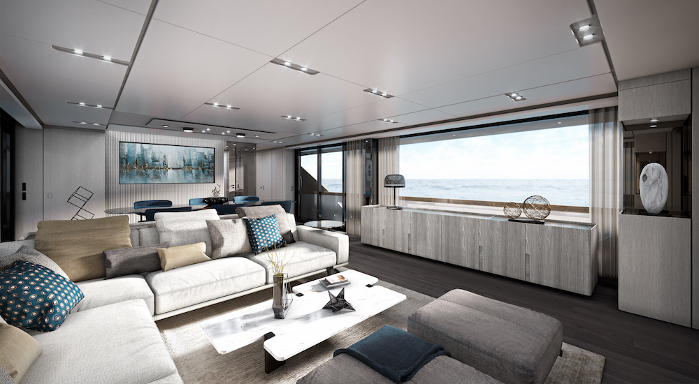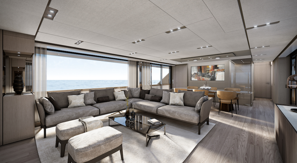 Linee che riprendono la filosofia progettuale inaugurata con gli ultimi modelli della gamma con però l’inserimento di nuove potenze laterali in cristallo sia a poppa sia a centro barca. Ma certo l’elemento più rilevante per la sua novità è la configurazione interamente wide body che significa grande disponibilità di spazi e la possibilità, come sottolinea l‘architetto Salvetti: «di introdurre un nuovo concetto di flusso a bordo volto a diventare un elemento iconico per le grandi di gamma».