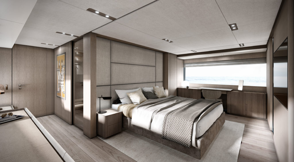 E ancora, i camminamenti laterali, oltre a consentire un facile accesso a fly, zona di prua e plancia, immette direttamente negli interni. Ambienti tutti all’insegna dello spazio e della massima ergonomia e che hanno come punto focale il salone con le sue vetrate a tutta altezza che, aperte, realizzano un’emozionante e scenografica terrazza affacciata sul mare. Una cucina di ben 10 metri quadrati di superficie che si affaccia sulla zona pranzo del living e la suite armatoriale a tutto baglio con il bagno, dove si coniugano marmi e legno, completa il main deck.