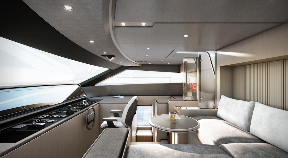 E allora saliamo virtualmente a bordo dell’ammiraglia di Ferretti Yachts per scoprire la possibilità di passare, tramite due scalinate laterali, direttamente dai 40 metri quadrati del beach club composto dalla spiaggetta di poppa e dal pozzetto, al flybridge. Ed è un collegamento diretto poppa-prua anche quello che, tramite i due passavanti, conduce al divano posto ai piedi del parabrezza di plancia e al vero e proprio living all’aperto arredato con divani e tavoli che, sempre a prua, precede l’area tecnica.