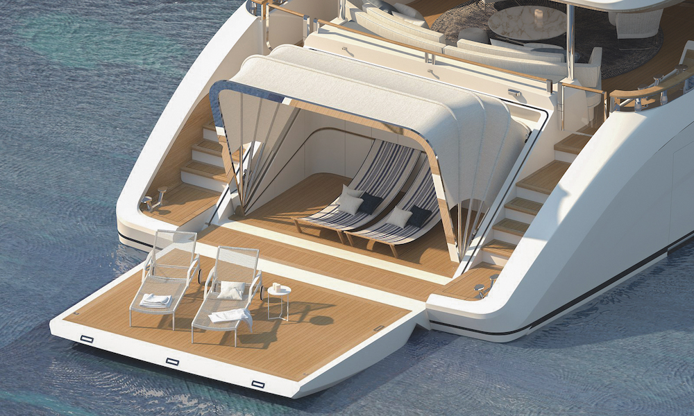 Maniacale, del resto, è il termine che meglio si addice a questo yacht. Tutto, a bordo, è stato definito nei minimi dettagli. La poppa, per esempio, è stata integrata nel volume dello scafo per rendere omaggio alle poppe tonde, ma anche per consentire di avere un portellone fortemente inclinato che non solo desse slancio alle linee esterne, ma che offrisse anche una maggior superficie da dedicare al beach club equipaggiato con una spettacolare capottina integrata che, all’occorrenza, regala ombra e privacy.