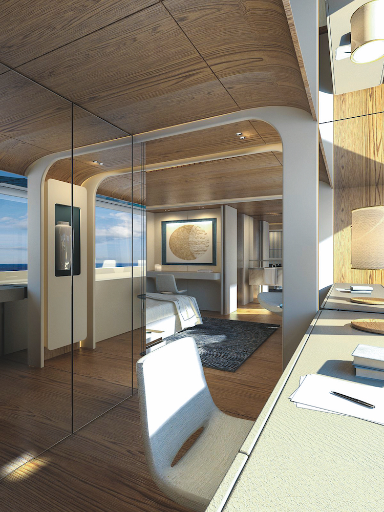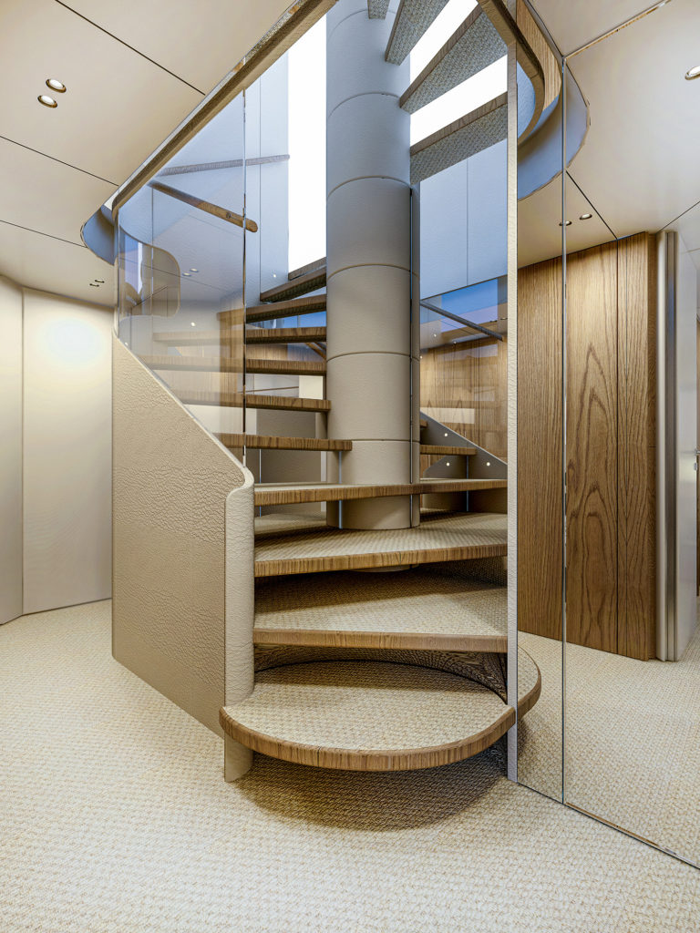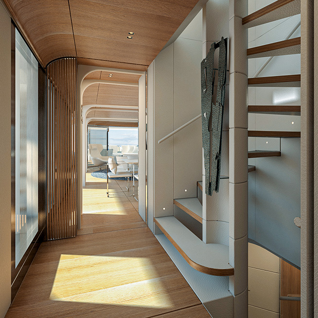 Queste ultime sono caratterizzate dalla scelta di Lazzarini Pickering di non rettificare le murate dello scafo e di lasciare la svasatura a vista, riproponendo il tema stilistico dei bagli con un’inversione di colori e materiali rispetto al main deck.