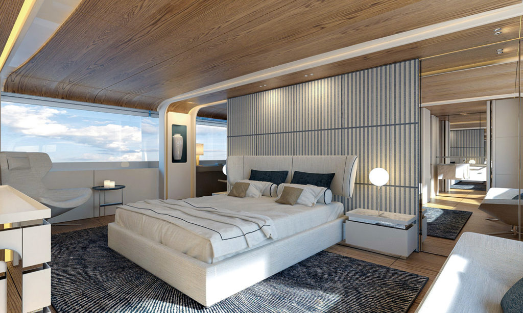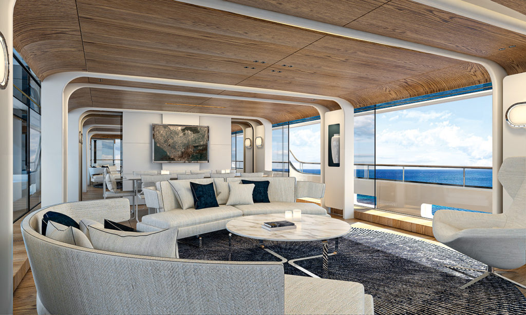 Per farlo lui e Carl Pickering hanno letteralmente smaterializzato le murate sostituendole con un gioco di specchi che riflette il panorama esterno ma, grazie a un sapiente gioco di prospettive, non le persone che popolano lo yacht, e hanno anche interpretato la struttura interna dello scafo come se fosse l’ossatura di una balena.