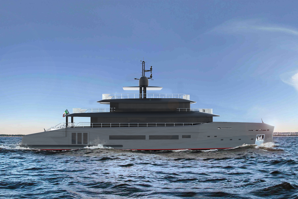 Anteprima mondiale per il nuovo 44,56 metri firmato dallo studio di Mauro Sculli. Si tratta di uno yacht con scafo in acciaio e sovrastruttura in alluminio articolato su tre ponti, uno dei quali interamente dedicato all’armatore. Quest’ultimo dispone infatti di tutto il ponte superiore, che tra interni ed esterni si estende per oltre 140 metri quadrati. Di questi 73 sono coperti e riservati alla suite armatoriale, gli altri 70 sono open air e parzialmente coperti dal tettuccio della tuga e ospitano un idromassaggio a poppa, ampie zone relax e lounge.