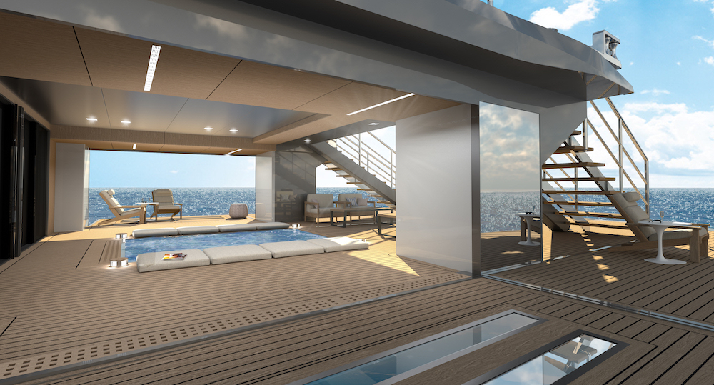 Grazie alle vetrate su tutti i lati, dalla cabina armatore si gode di un panorama a 360°. Gli ospiti dispongono invece di due cabine vip e altrettante matrimoniali. Le aree comuni, sul ponte principale, comprendono un grande salone di 60 metri quadrati con sala da pranzo che può essere separata grazie a pannelli scorrevoli e di una cucina attrezzata con montavivande. Sullo stesso ponte sono previste anche la plancia di comando e la cabina del comandante che è accanto alla sala radio. Una grande gru a telaio integrata nella zona di poppa del ponte principale permette di varare un tender fino a 11 metri o un tender da 8 metri e un’auto. Una volta liberata dai tender, la zona di poppa diventa una splendida beach area con piscina e ali laterali abbattibili che consentono di espandere la superficie di quest’area dello yacht fino a 170 metri quadrati. L’equipaggio previsto è di 10/12 persone.
